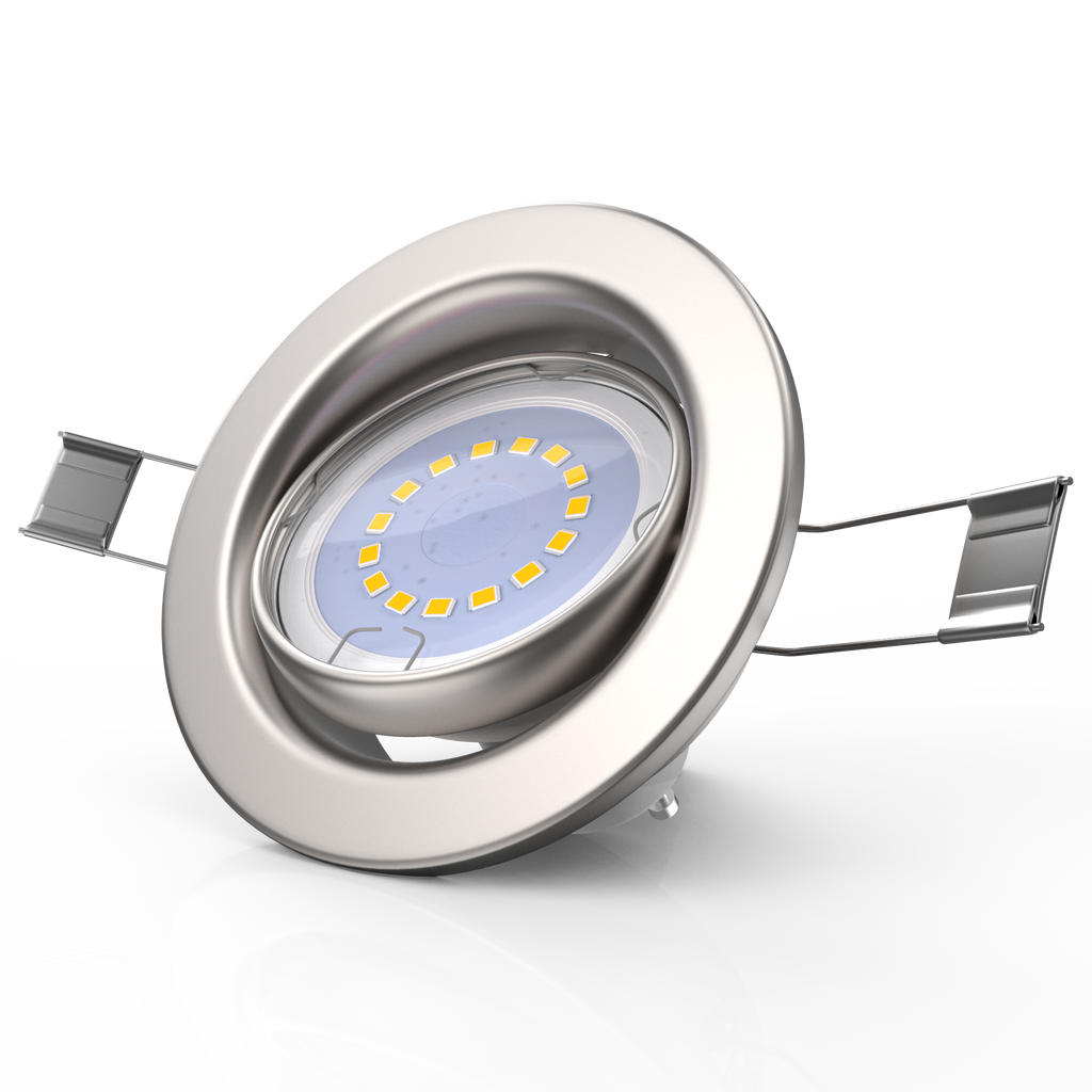 Diese schwenkbaren LED Einbauleuchten präsentieren sich im schlichten Design, angenehm modern und dezent. Einbauleuchten sind universell einsetzbare Lichtspender, die in Wohnräumen, in der Küche, im Flur oder im Treppenhaus eingebaut werden können. Die Lieferung erfolgt mit energiesparenden, warmweißen LED Leuchtmitteln mit der Fassung GU10. Der matt-nickel-farbige Rahmen der Einbauleuchte Perseus ist so konstruiert, dass das Leuchtmittel geschwenkt werden kann. So können Sie besonders sehenswerte Stellen in Ihrem zu Hause hervorragend ins rechte Licht rücken. Das Besondere am 5er-Set "Perseus": Die Strahler können ohne Dimmer in 3 Stufen gedimmt werden. Die Steuerung erfolgt über einen haushaltsüblichen Lichtschalter. Wird das Licht kurz aus- und wieder eingeschaltet, ist die Dimmfunktion aktiv. Nach der dritten Dimmstufe folgt dann wieder die volle Leuchtkraft.
