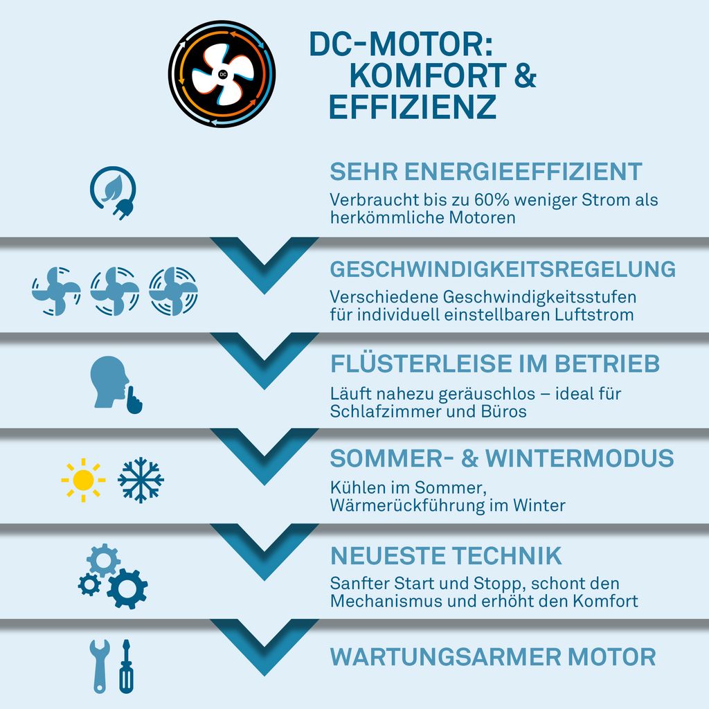 Der eingebaute Ventilator arbeitet mit moderner DC-Motor-Technik, wodurch er besonders leise und energiesparend läuft. Mit drei Geschwindigkeitsstufen lässt sich die Luftbewegung optimal an verschiedene Raumsituationen anpassen.