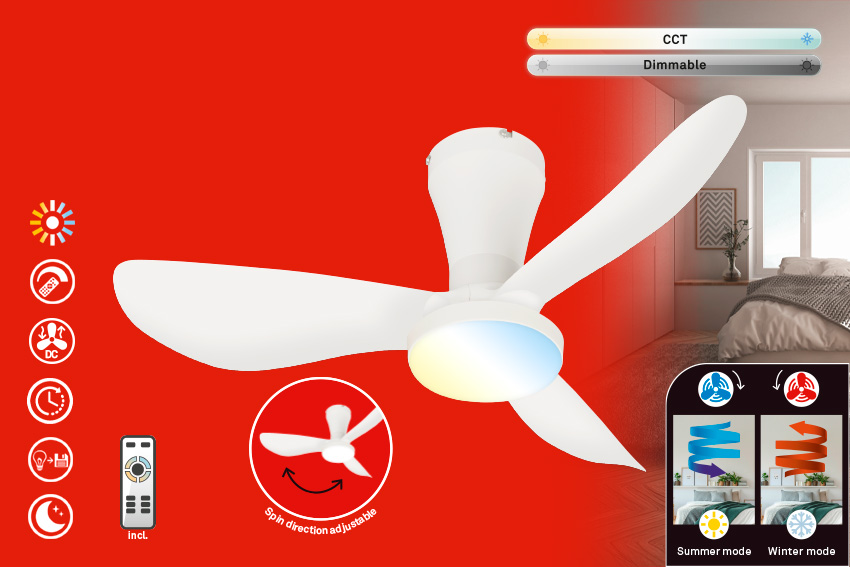 Im Sommer sorgt der Vorwärtslauf für einen kühlenden Luftstrom. Im Winter verteilt der Rückwärtslauf die warme Luft, die sich unter der Decke sammelt, wieder gleichmäßig im Raum. Dadurch unterstützt der Deckenventilator eine angenehme Temperatur zu jeder Jahreszeit.