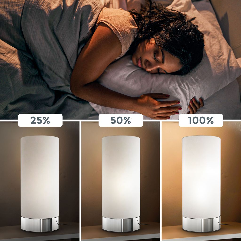 Das Design der Tischleuchte ist mit der schlichten Form funktional und zu nahezu jedem Einrichtungsstil passend. Durch den Touchdimmer lässt sich die Nachttischleuchte einfach Bedienen. Sie haben die Wahl zwischen vier verschiedenen Helligkeitsstufen.