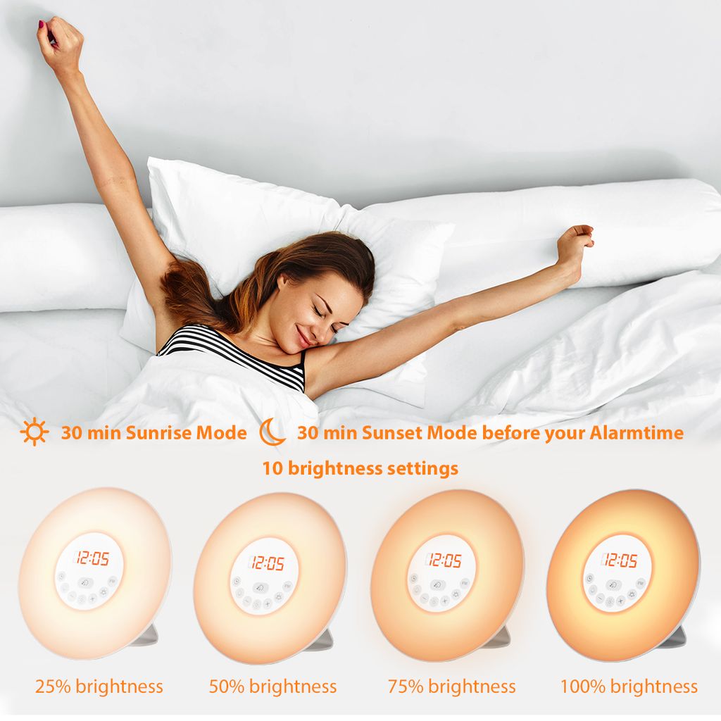 - Endlich entspannt aufwachen. Unser Tagslichtwecker mit Sonnenaufgangssimulation und Sonnenuntergangsfunktion bietet eine hervorragende Lichtsimulation, um Sie sanft aus Ihrem Schlaf zu holen. 30 Minuten vor Ihrer eingestellten Weckzeit beginnt das erholsame Aufwachprogramm