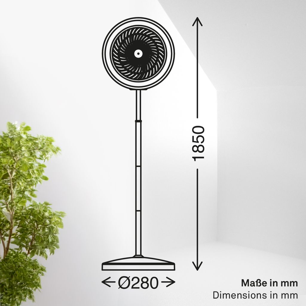 Mit einem Durchmesser von 280 mm und einer Höhe von 1.850 mm fügt sich die Leuchte gut in verschiedene Wohnbereiche ein und verbindet Beleuchtung mit Luftzirkulation.