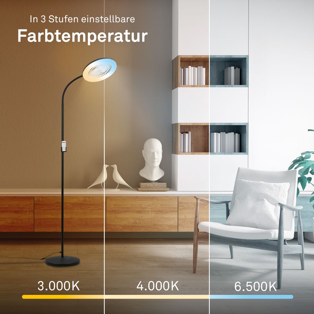 Der Standventilator bietet verschiedene Lichtfarben von 3.000 K warmweiß über 4.000 K neutralweiß bis 6.500 K tageslichtweiß. Zusätzlich stehen frei wählbare Farben und bunte Farbmodi für abwechslungsreiche Lichtakzente zur Verfügung.