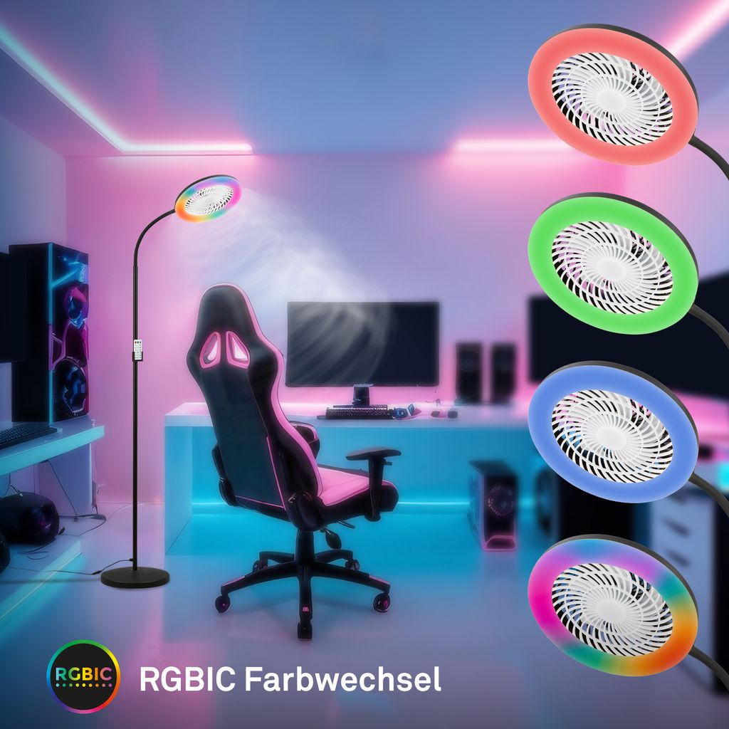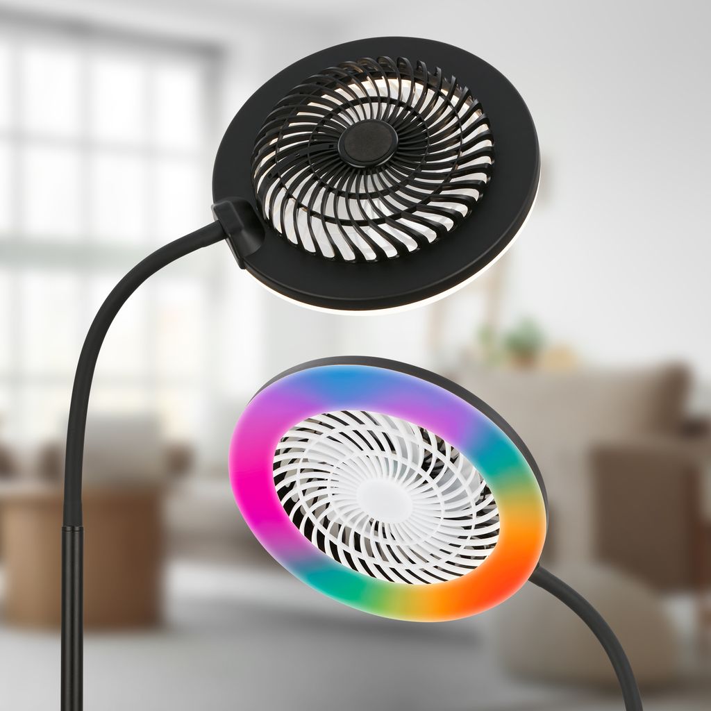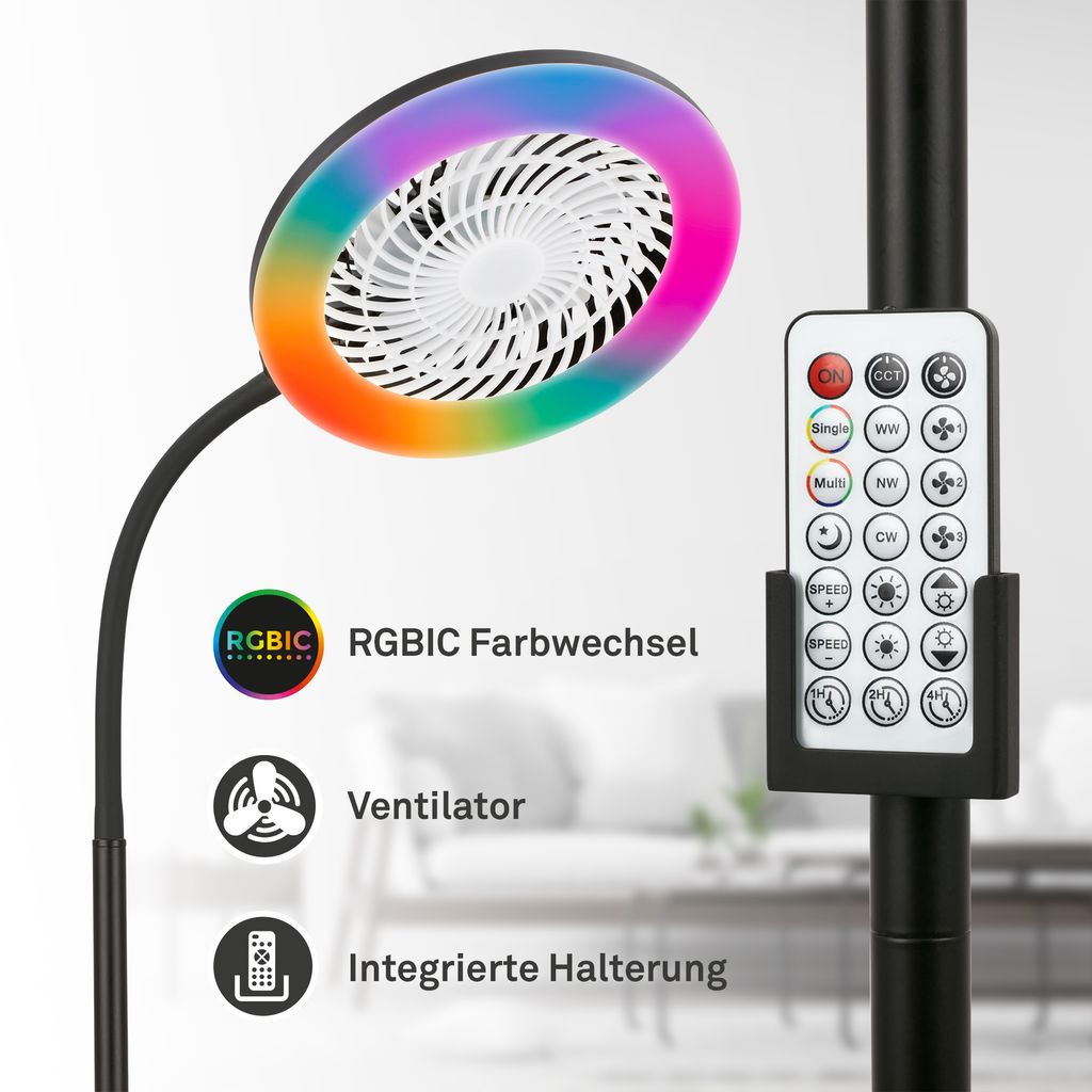 Die CCT RGBIC Stehleuchte in Schwarz kombiniert eine LED Lichtquelle mit 13,8 W und 1.380 Lumen mit einem integrierten Ventilator mit 4 W. Dadurch verbindet die Leuchte Beleuchtung und Luftbewegung in einer schlanken Bauform.