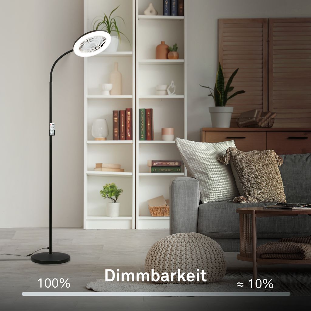 Der integrierte Ventilator der Stehlampe verfügt über drei Geschwindigkeitsstufen. So lässt sich die Luftbewegung im Raum einfach anpassen.